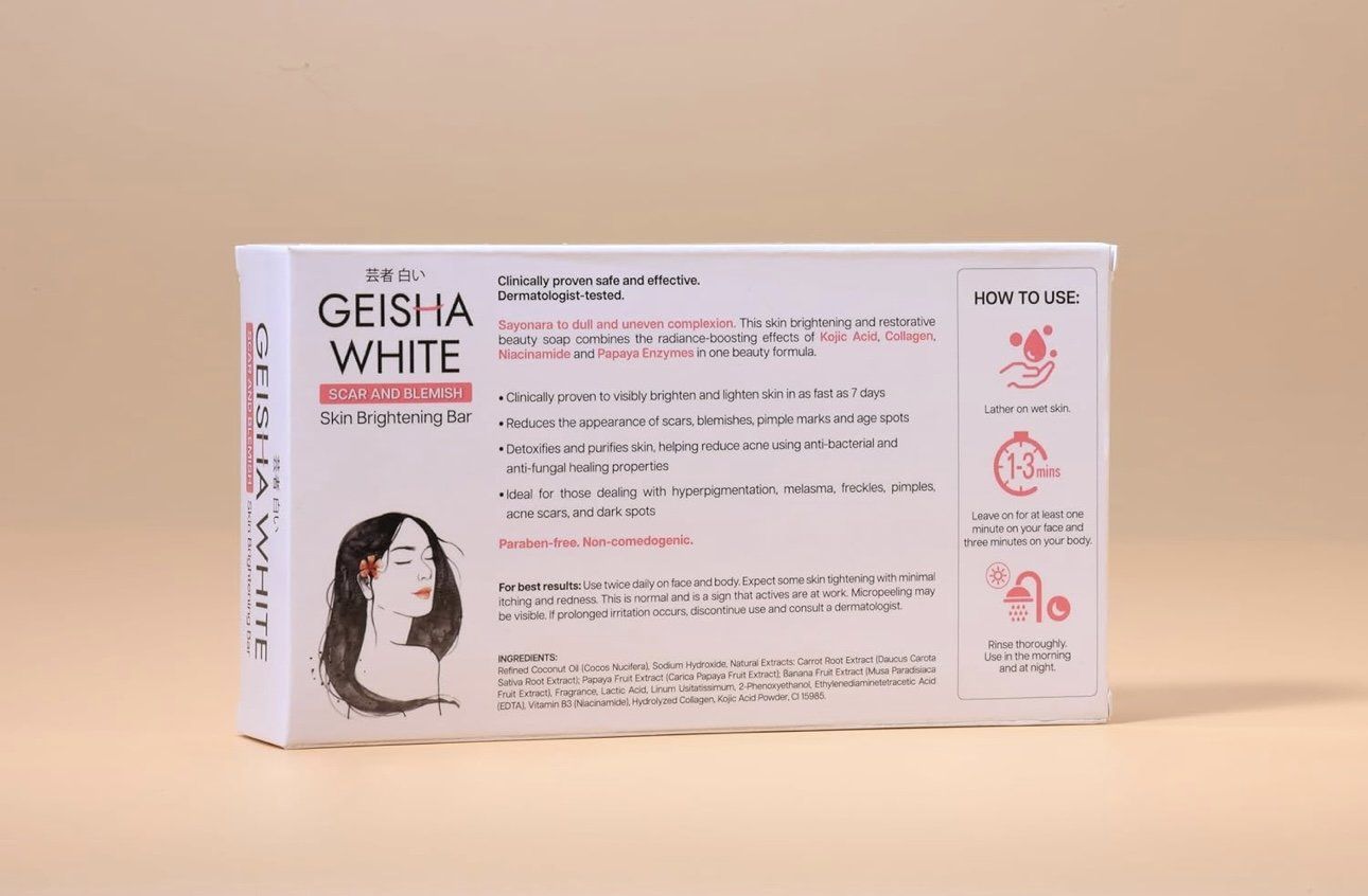 Une peau plus lumineuse et plus saine, rapidement! Geisha White est votre savon beauté indispensable pour un teint éclatant en toute sécurité. Sa formule aprouvée propulse l'acide kojique au sommet en l'associant à d'autres ingrédients premium grâce aux dernières avancées technologiques en cosmétique japonaise.