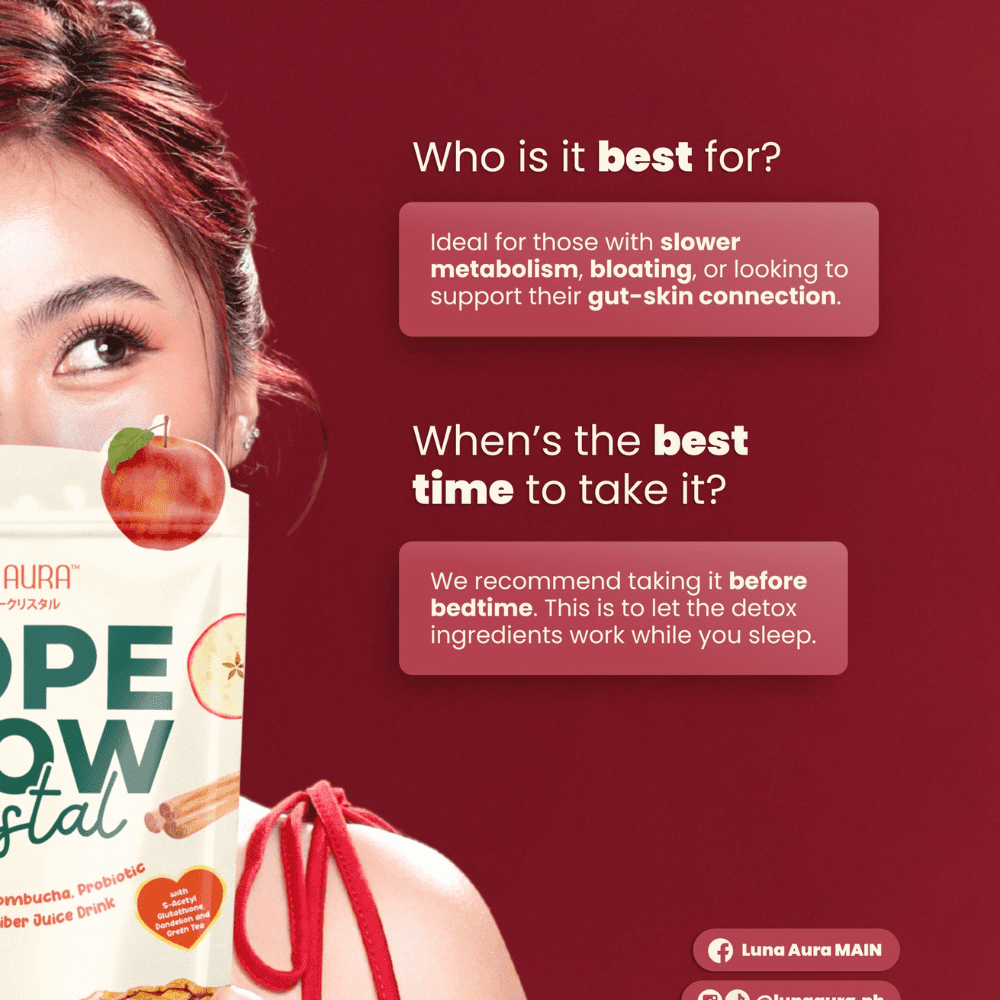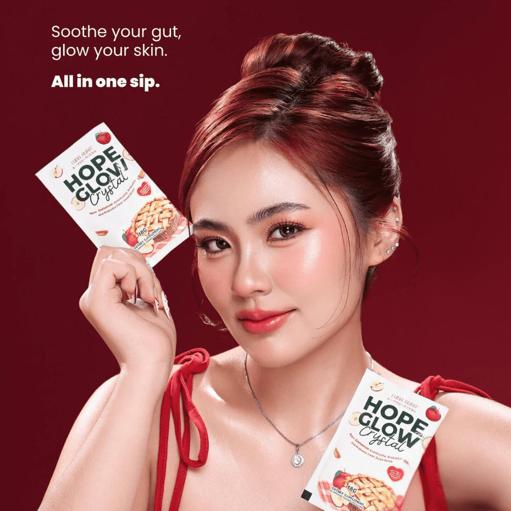 Luna Aura Hope Glow Crystal allie le goût rafraîchissant de la pomme cannelle aux bienfaits naturels de la racine de pissenlit et du kombucha. Chaque sachet associe probiotiques, prébiotiques et extraits botaniques pour favoriser la santé intestinale.