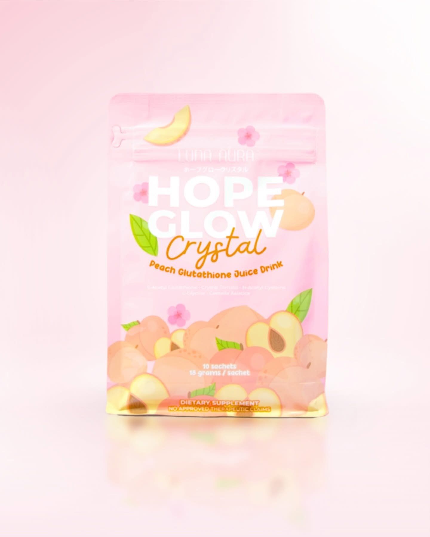 Découvrez votre dose quotidienne de bien-être dans une boisson délicieuse ! Hope Glow Crystal est un jus éclaircissant à la pêche, formulé avec du glutathion de qualité supérieure et de puissants antioxydants pour sublimer l'éclat naturel de votre peau.